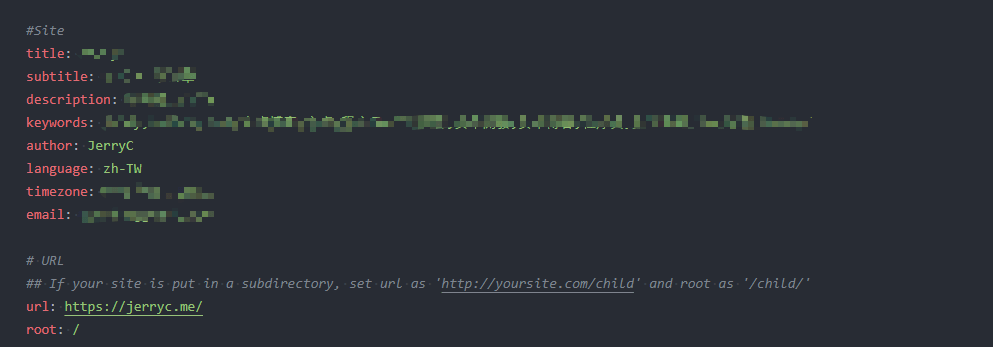 修改網站各種資料,例如標題、副標題和郵箱等個人資料,請修改博客根目錄的_config.yml