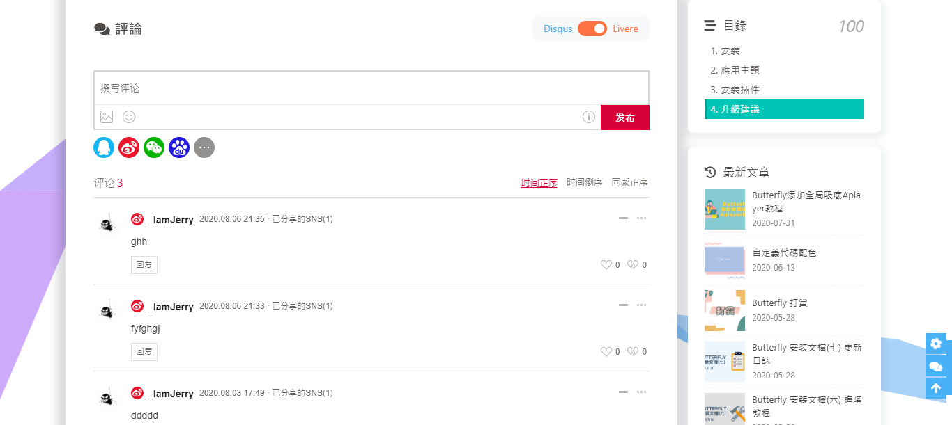 註冊來必力,配置你自己的來必力設置,然後在Butterfly裏開啟它。